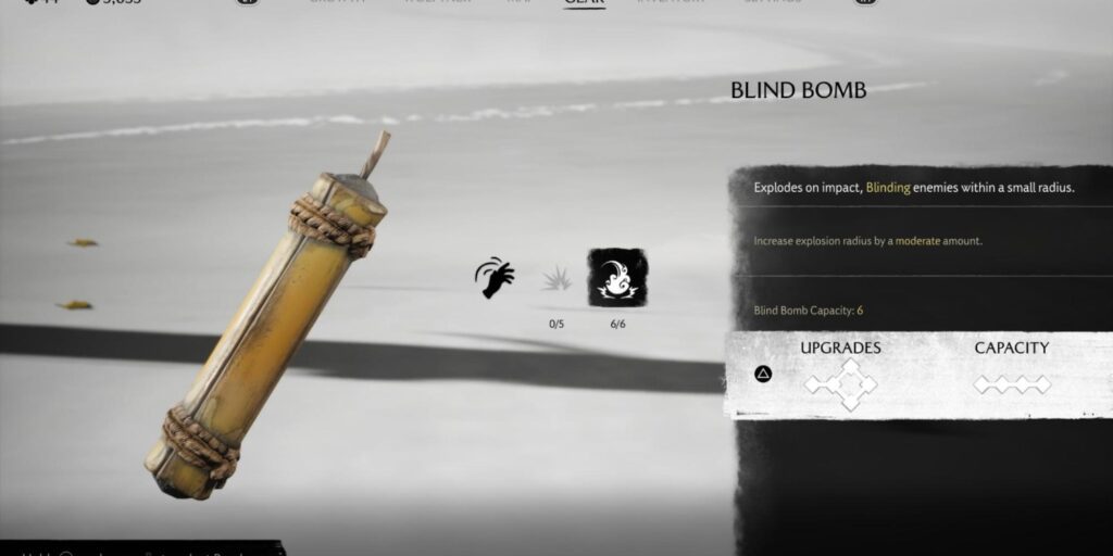 Altered blind bombs cause additional explosive damage for 300 coins and 10 black powder. The reinforced blind bomb increases the burning damage and duration for 550 coins, 20 black powder, and 5 Oni Raider Mask pieces. The enhanced blind bomb increases the explosion radius for 1000 coins, 30 Black Powder, and 10 Oni Raider Mask Pieces. Finally, the perfected blind bomb massively increases its explosion damage for 2500 coins, 20 oni raider masks, and 10 rare wood.