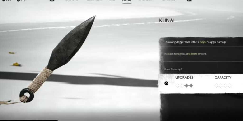 You start with four kunai but can increase the capacity in exchange for currency and materials. For 5 kunai, you need 300 coins. For 6 kunai, you need 400 coins and 30 metal. For the maximum 7, you need 625 coins, 10 rare metals, and 5 rare wood.