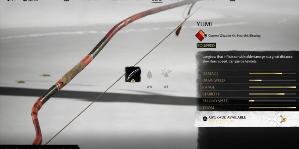 The altered Yumi unlocks the disarm arrows and costs 450 coins and 40 young bamboo. The reinforced Yumi costs 750 coins, 100 young bamboo, and 20 Oni masks. The enhanced Yumi costs 1500 coins, 100 young bamboo, and 20 shinobi steel. Finally, the perfected Yumi costs 2500 coins, 10 gun parts, and 20 rare wood, and unlocks explosive arrows.