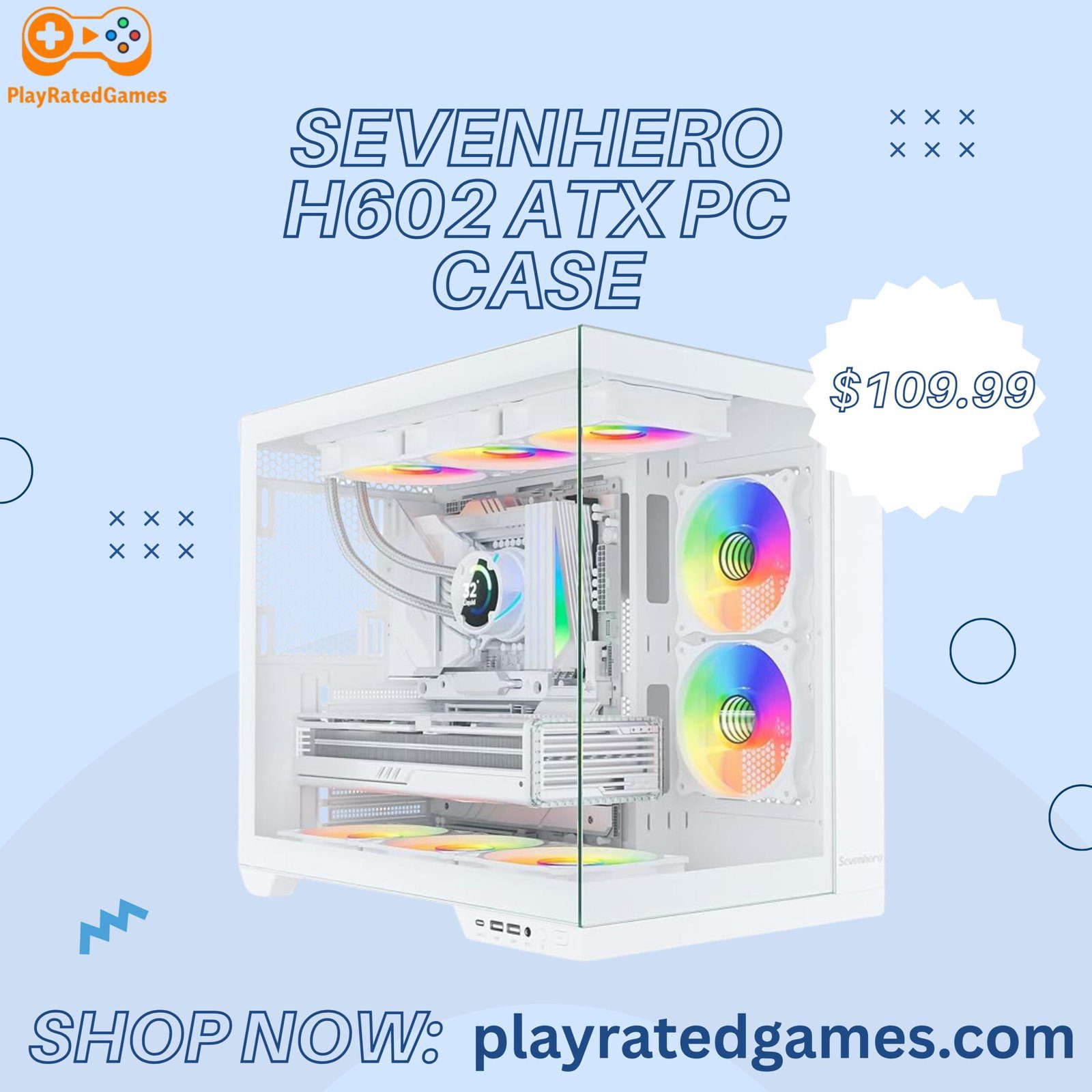 The Sevenhero H602 Mid-Tower Gaming Computer Case features a sleek panoramic tempered glass design with five pre-installed 120mm PWM ARGB fans. Built for both aesthetics and airflow, it supports high-end configurations including 360mm AIO coolers, 400mm GPUs, and 200mm PSUs.